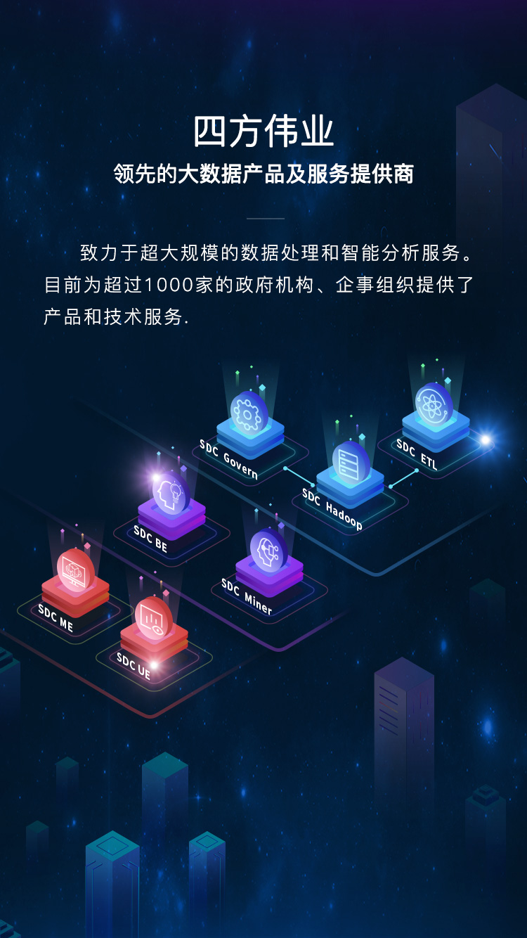 致力于超大規模的數據處理和智能分析服務。目前為超過1500家政府機構、企事組織提供了產品和技術服務。